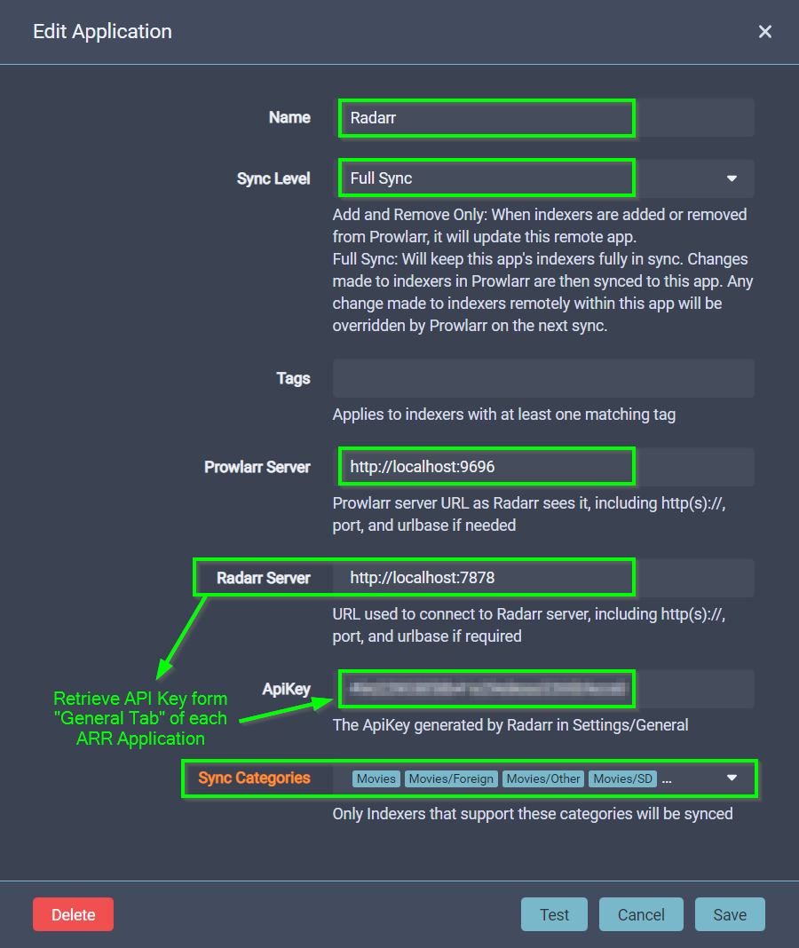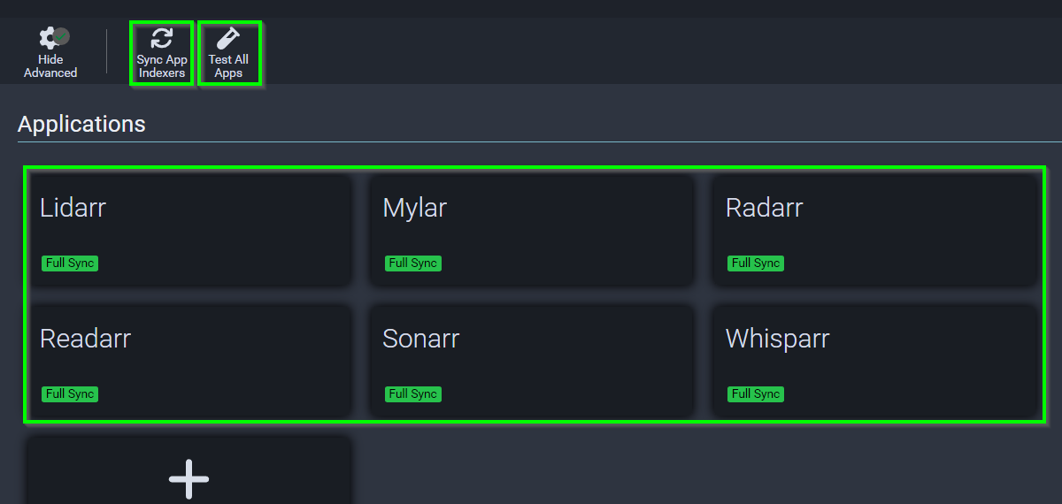 Add *ARR applications: Prowlarr → Settings → Apps then add each of the applications.