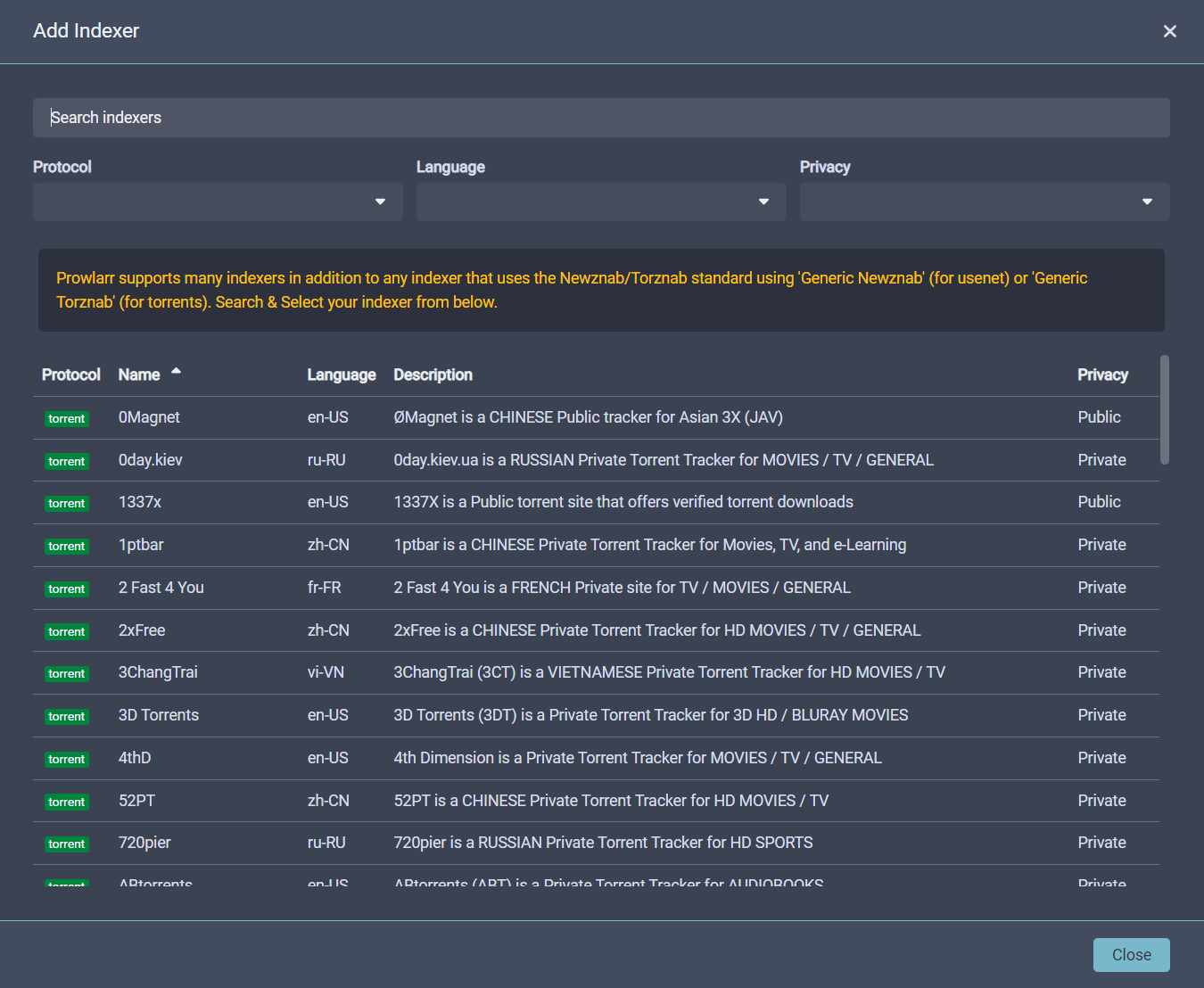 Prowlarr is a indexer manager/proxy built on the popular arr .net/reactjs base stack to integrate with your various PVR apps. Prowlarr supports both Torrent Trackers and Usenet Indexers. It integrates seamlessly with Sonarr, Radarr, Lidarr, Readarr, and Whisparr offering complete management of your indexers with no per app Indexer setup required (Prowlarr does it all).
