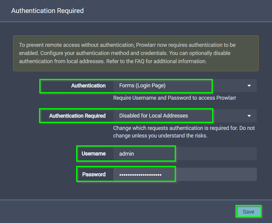 Go to the Prowlarr WebUI. If this is the first time using Prowlarr, you will be presented with an Authentication Required dialog, as Prowlarr now allows admins to prevent unauthorised access to the application. You can select Forms (Login Page) → Disabled for Local Address → Add Username and Password → Save to continue.