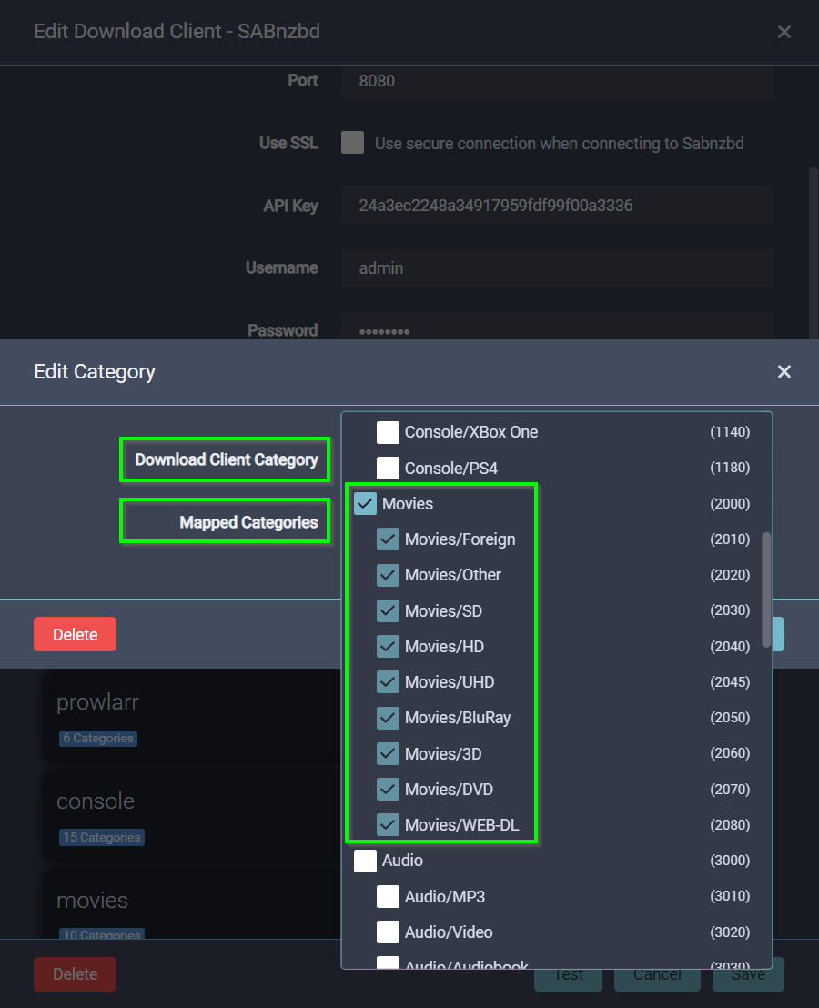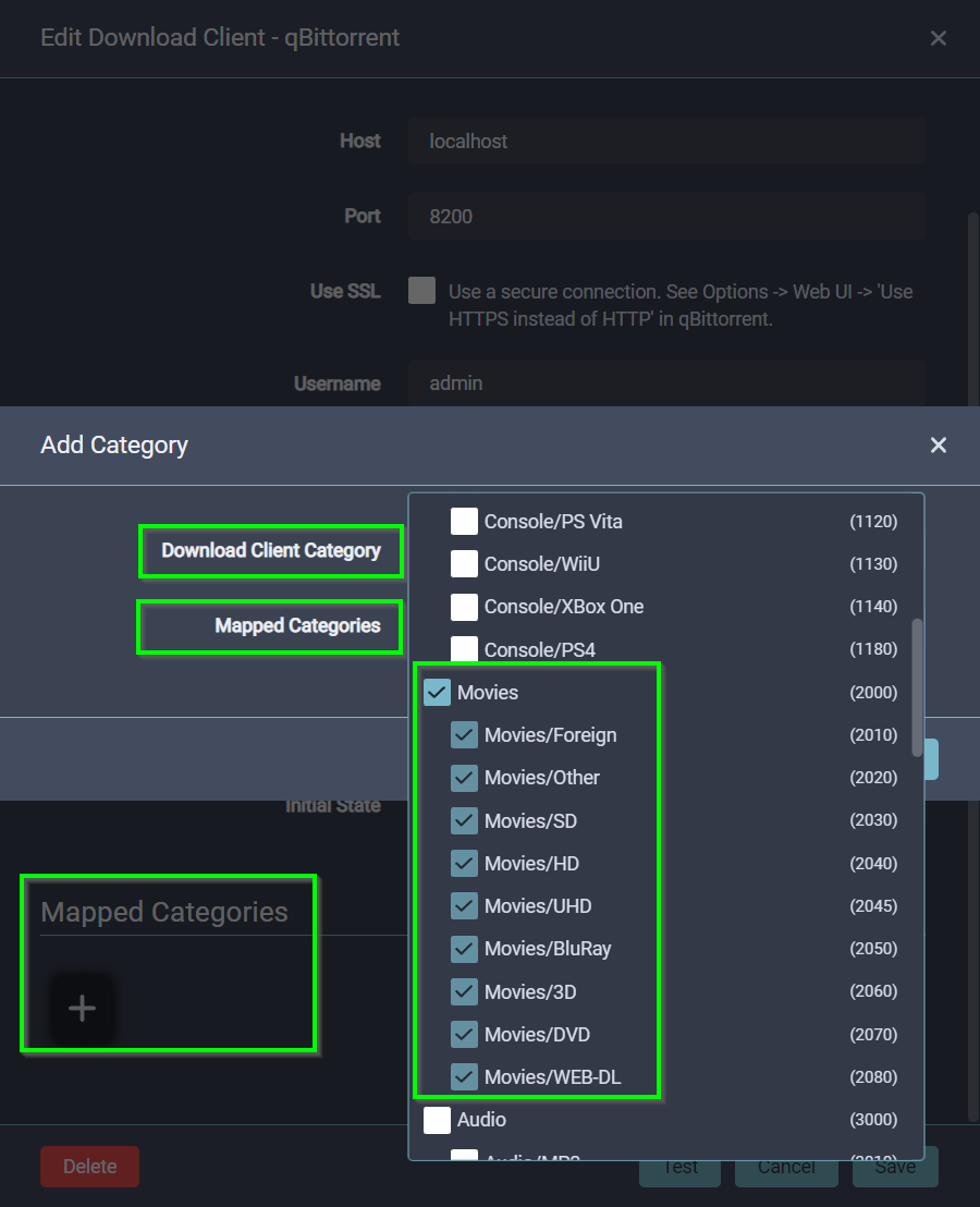 Add each of the Download Client Categories listed in the table below, and select the tick boxes next to each of the Mapped Categories to set up the automatic download mappings.
