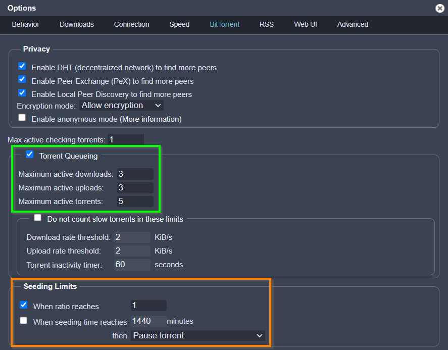 Change the Torrent Queueing settings to tune how many active downloads / uploads / torrents your qBittorrent client will run concurrently.
