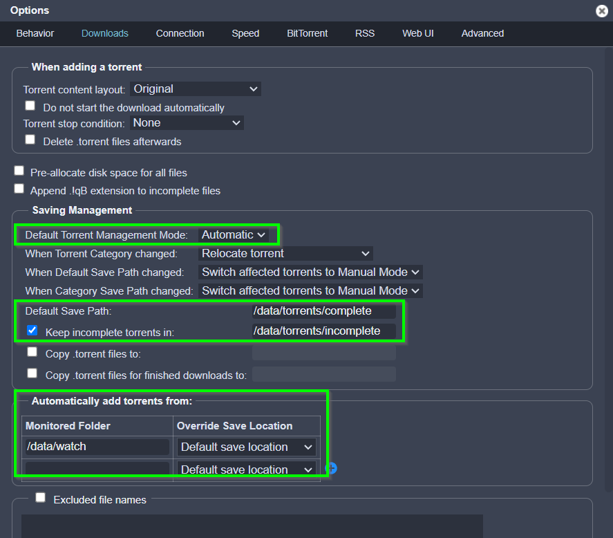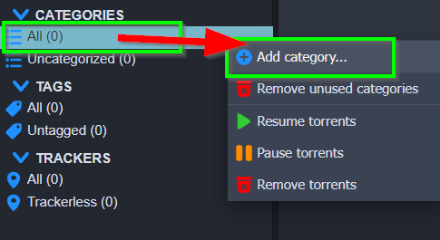 Create a new category for each folder located in the /data/torrents folder, except for the complete and incomplete folders, as these are working folders, not specifically set up to manage categories.