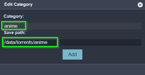 Category Names and Save Paths are case senstive and must be added in lower case, to match the underlaying Linux filesystem inside the Docker images, and / or, the localhost, and also for communication between the different applications.