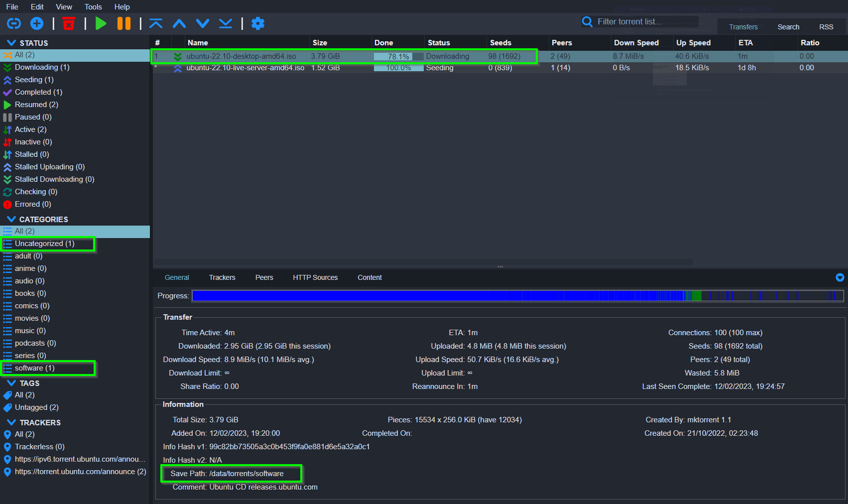 If you inspect the completed torrent downloads, you will notice the manual download was not association with a category and was moved into the /data/torrents directory, while the second download was assigned a category and was moved into the /data/torrents/software directory.