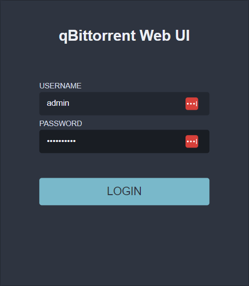 The default username and password in earlier versions of qBittorrent, used to be admin and adminadmin respectively, however the password is now randomly generated every time qBittorrent is started until a permanent password is set.
