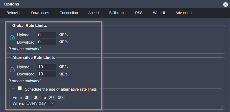 If you have a low Internet connection and only want to download while your sleeping, then restrict the Global Rate Limits to a smaller limit, then set the Alternate Rate Limits to a higher number (or "0" for unlimited), then enable the schedule for when the alternate rate limit should be used... i.e. when you're sleeping.