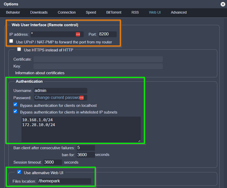 Default Username and Password can be changed by navigating to Options Icon → Web UI → Authentication