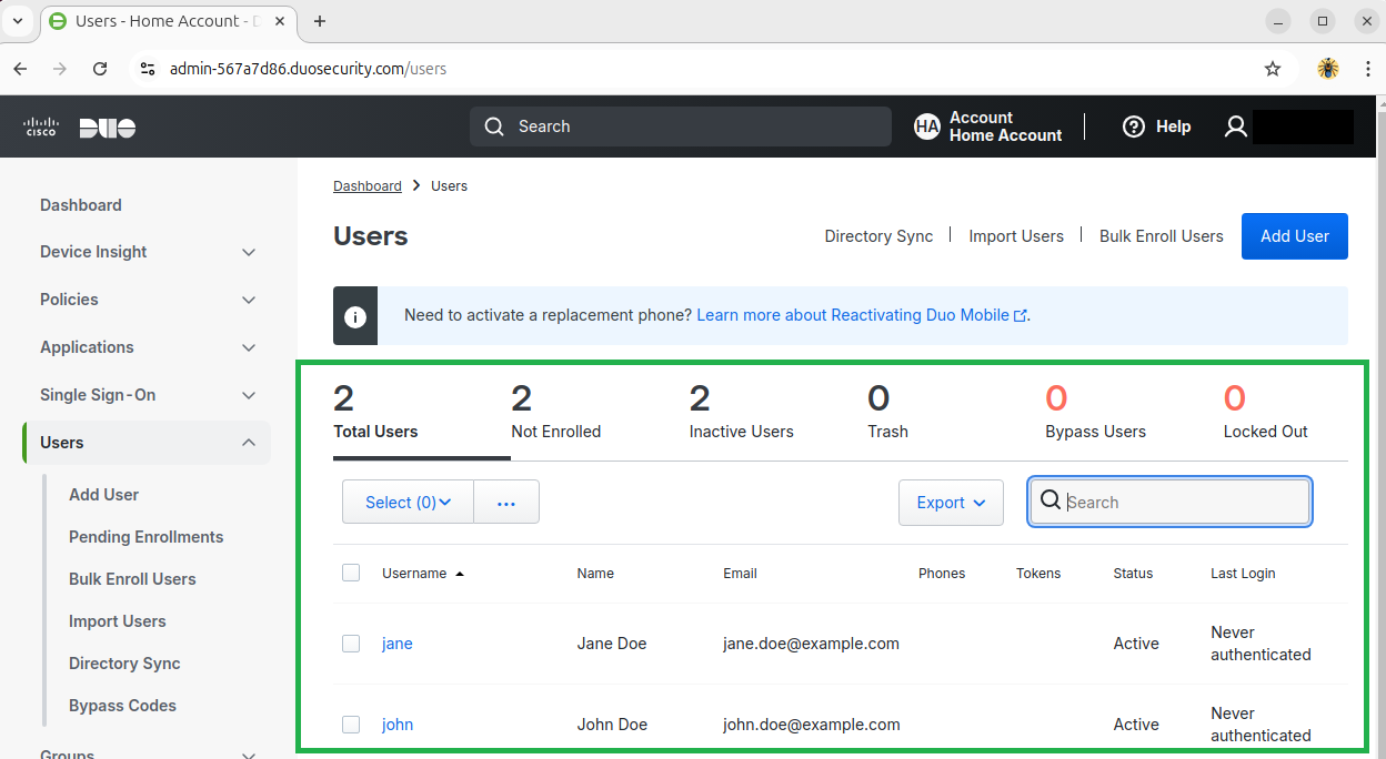 When we set up DUO Security in the Admin portal, would have created several users, and sent them an enrollment email from inside the portal.