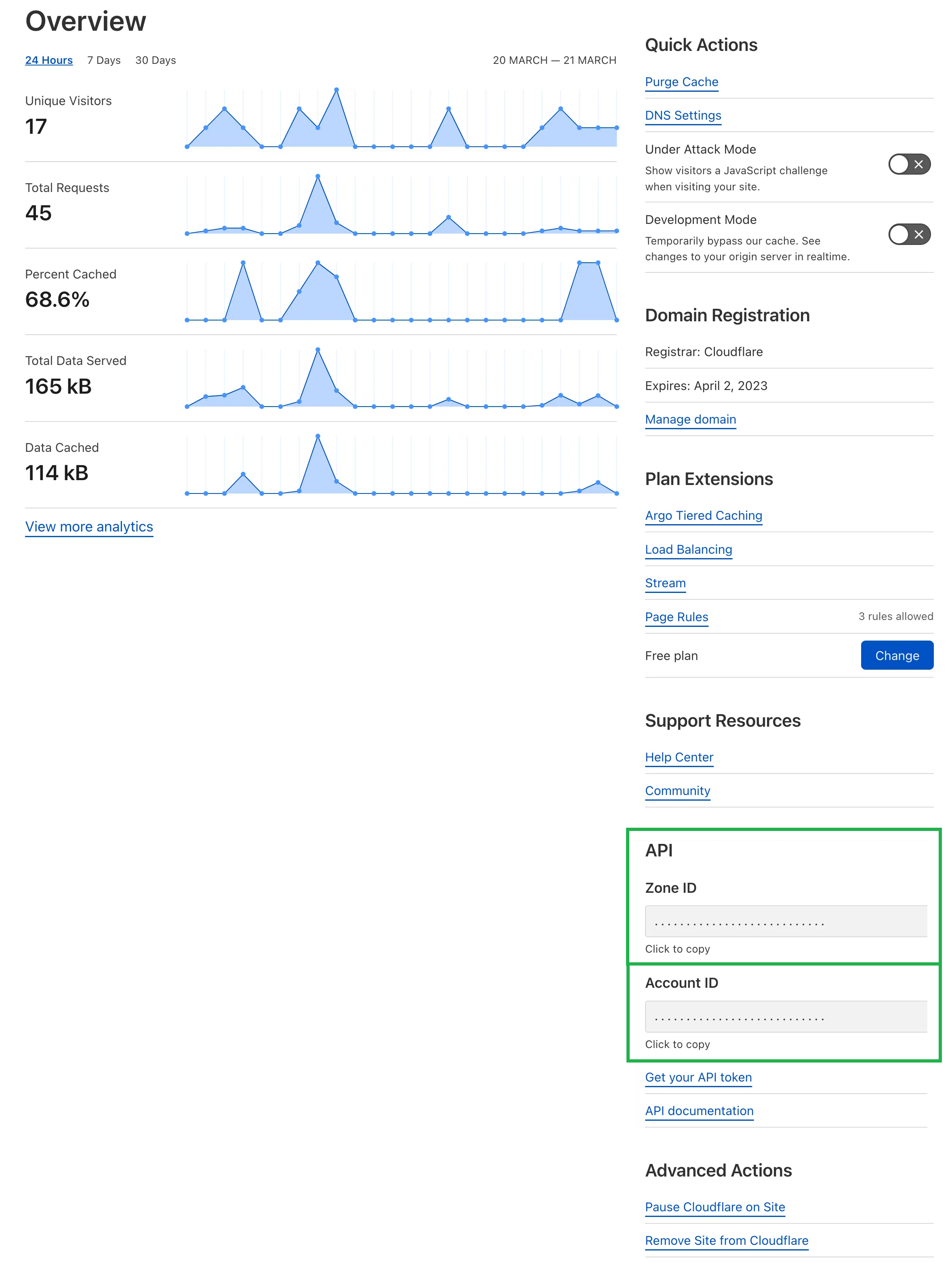 The API section contains your Zone ID and Account ID. To copy these values for API commands or other tasks, select Click to copy.
