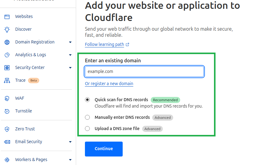 If you already have your own domain name, then you can add it to Cloudflare to manage the domains and resolution, just be sure to update the "nameserver" records with your DNS Registrar.