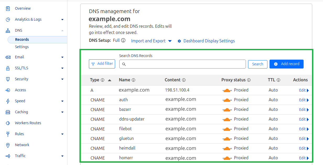 All of the subdomain CNAMES needed for your Remote MediaStack have now been added, however they all still point to the Cloudflare example IP Address of 198.51.100.4, which we want to be able to update with DDNS-Updater, any time our home IP Address changes.