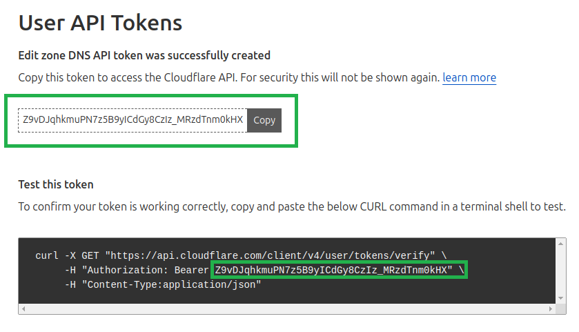 Make sure you save the Cloudflare API Token somewhere safe, as Cloudflare will not display this Token again. If you forget the Token, you will need to regenerate a new one and manually update all of your configurations.