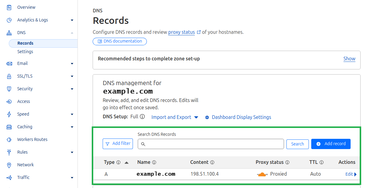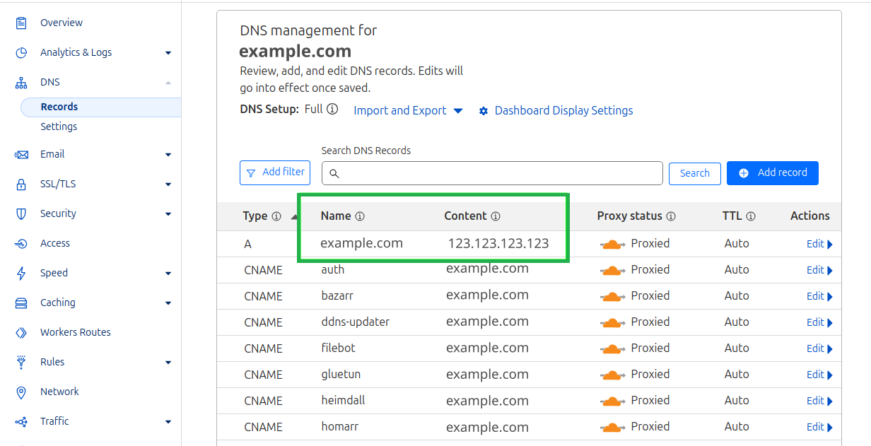 In the example below, we are setting the 198.51.100.4 IP Address to your domain name, which is a Cloudflare example IP Address, and we will update it a few steps below when using DDNS-Updater.