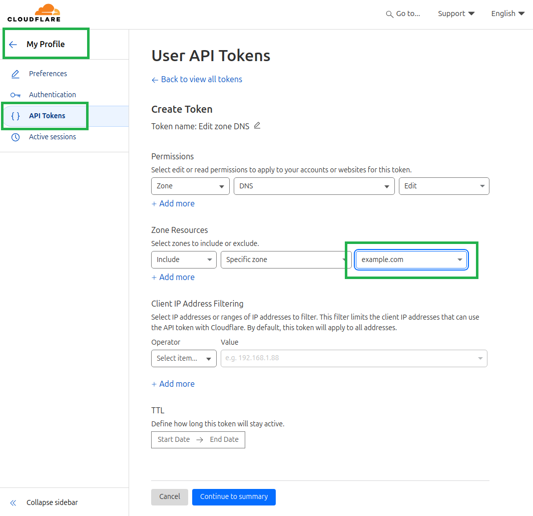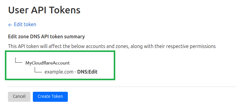 - If you're happy with the details on the "Edit zone DNS API token summary" page, then select "Create Token".