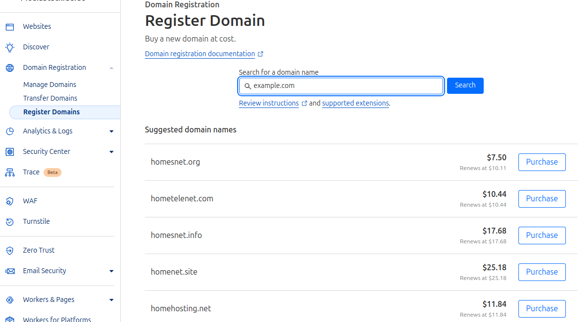 Cloudflare instructions to register a new domain name: https://developers.cloudflare.com/registrar/get-started/register-domain
