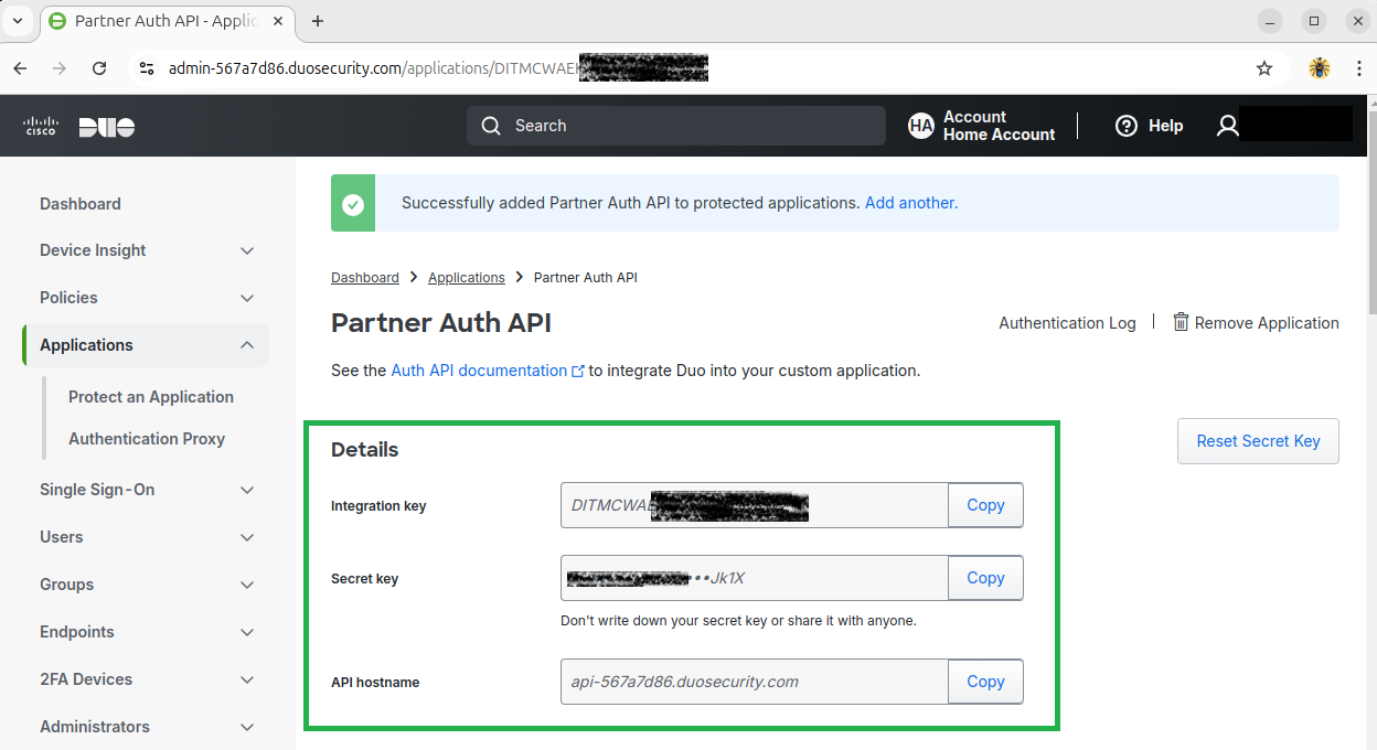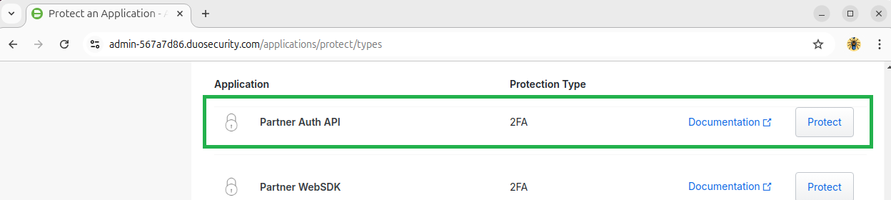In the Admin Portal, select "Applications" → "Protect An Application" → "Partnet Auth API".