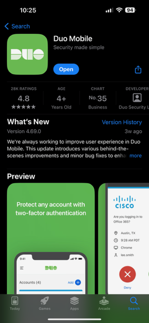 First, we'll install the mobile phone application. Head over to the application store on your mobile phone, and install the "DUO Mobile", by "DUO Security LLC", which we need when we register the free account DUO Security portal.