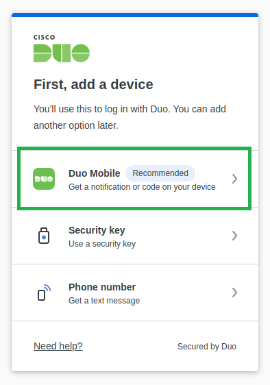 After scanning the QR Code, select "DUO Mobile" to link the application to your DUO Admin portal.