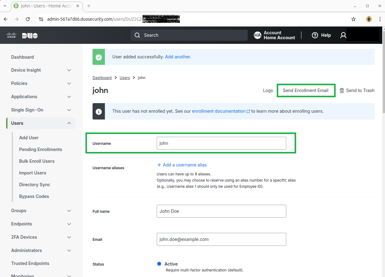 NOTE: Afte creating each user account, you must press "Send Enrollment Email", so they are emailed the QR Code needed to set up their DUO Security Mobile apps and link to your DUO Security account.